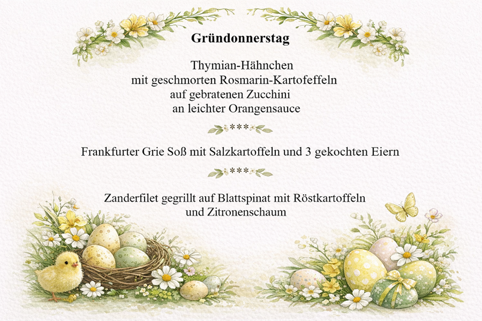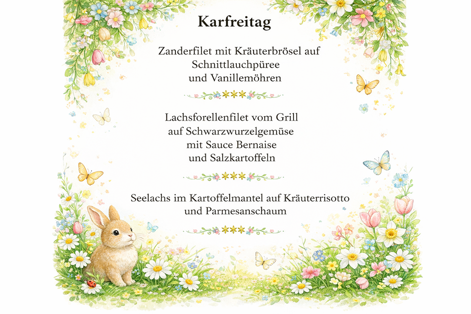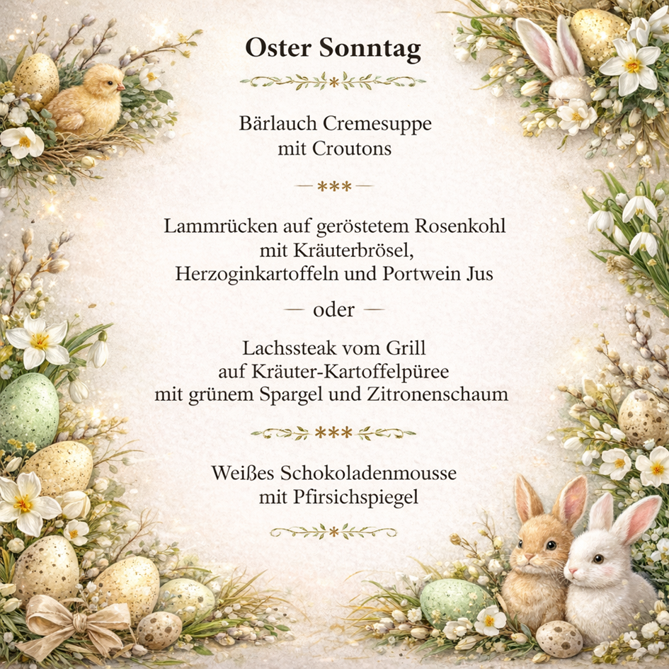 Freuen Sie sich auf ein liebevoll zusammengestelltes Osterangebot mit frischen Zutaten. Ob mit Familie, Freunden oder zu zweit – erleben Sie unvergessliche Genussmomente in idyllischer Umgebung.